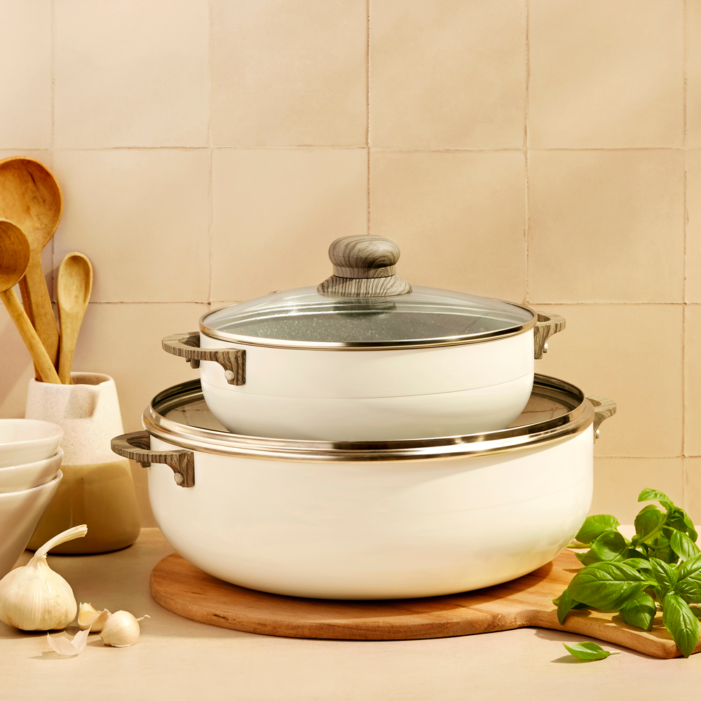 The non-stick pots reduce calories in your meals by up to 80%, without the need for additional fat. Oven-safe iron handles ensure durability. The heat distribution plate guarantees even cooking on ovens, gas, electric, and induction stoves.